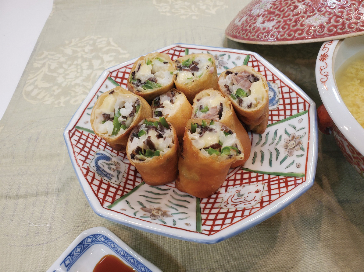 ①白身魚は皮を取り、2、3mm程度のそぎ切りにする。 ②ピーマン、タマネギ、戻したキクラゲを千切りにする。 ③ボウルに①、②を合わせ、Aを加えてよく混ぜ、6等分する。 ④春巻きの皮に③をのせ、プロセスチーズを芯にして包む。巻き終わりは小麦粉と水を混ぜ合わせたのりで付ける。 ⑤④を180度の油でこんがり色づくまで揚げる。食べやすく切って皿に盛り付けて出来上がり。お好みでトマトケチャップや辛子じょうゆ(材料外)でいただく。