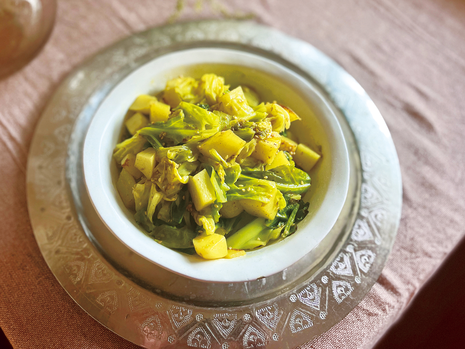 春キャベツと新ジャガイモのごまサブジ(インド風蒸し炒め)