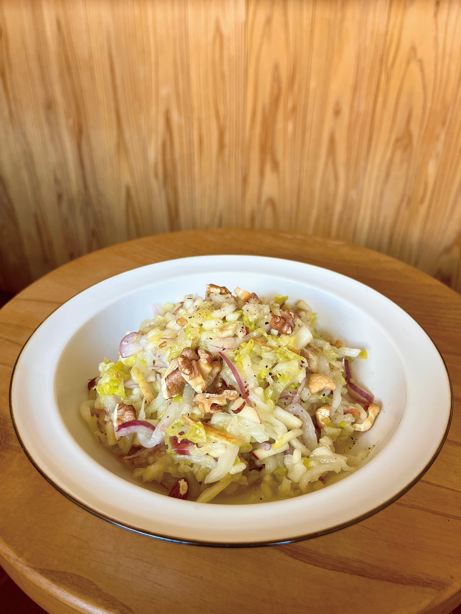 ①ハクサイは繊維を断ち切る方向に千切りにし、塩もみしておく。リンゴは千切りに、赤タマネギは薄くスライスして水にさらし、水気を絞っておく。ミックスナッツは粗く刻んでおく。 ②ハクサイの水気を絞って、残りの材料を全て加えて混ぜ合わせる。